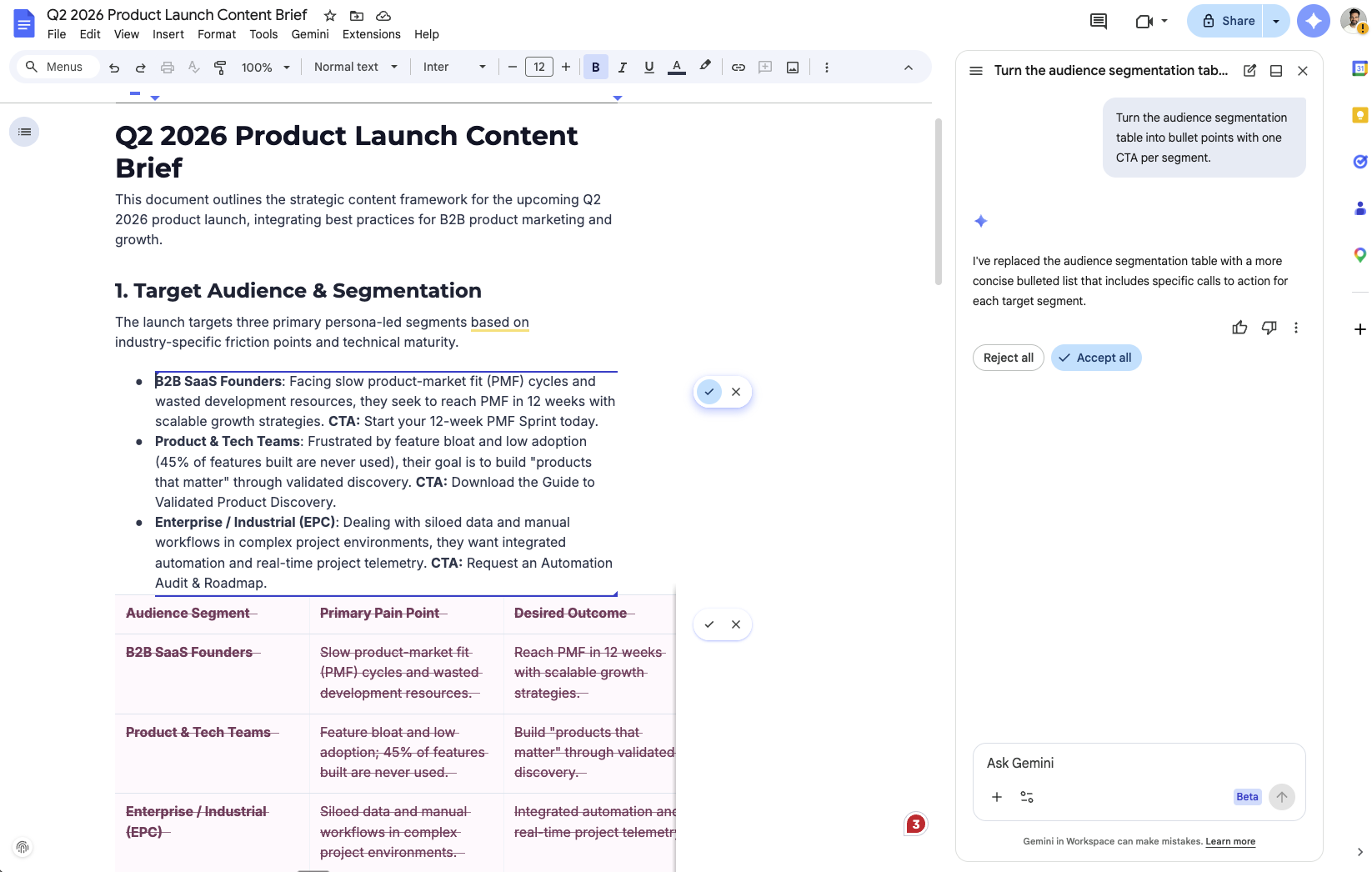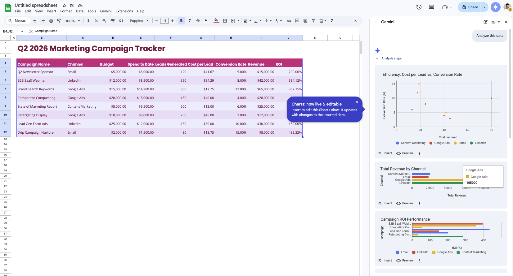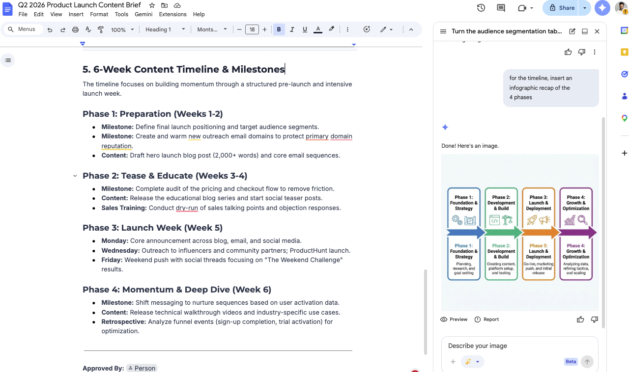 Pre-fill with any campaign data you can find in my recent emails or Drive files related to Q1 2026 campaigns.The “Fill with Gemini” trick for competitive research